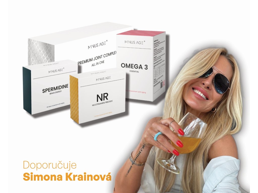The Minus Age bundle by Simona Krainová enhances beauty and vitality not just externally. Thanks to the synergy of NR, Spermidine, Omega 3, and collagen, the body receives support on a cellular, hormonal, and structural level – for lasting energy, flexibility, and a youthful appearance.